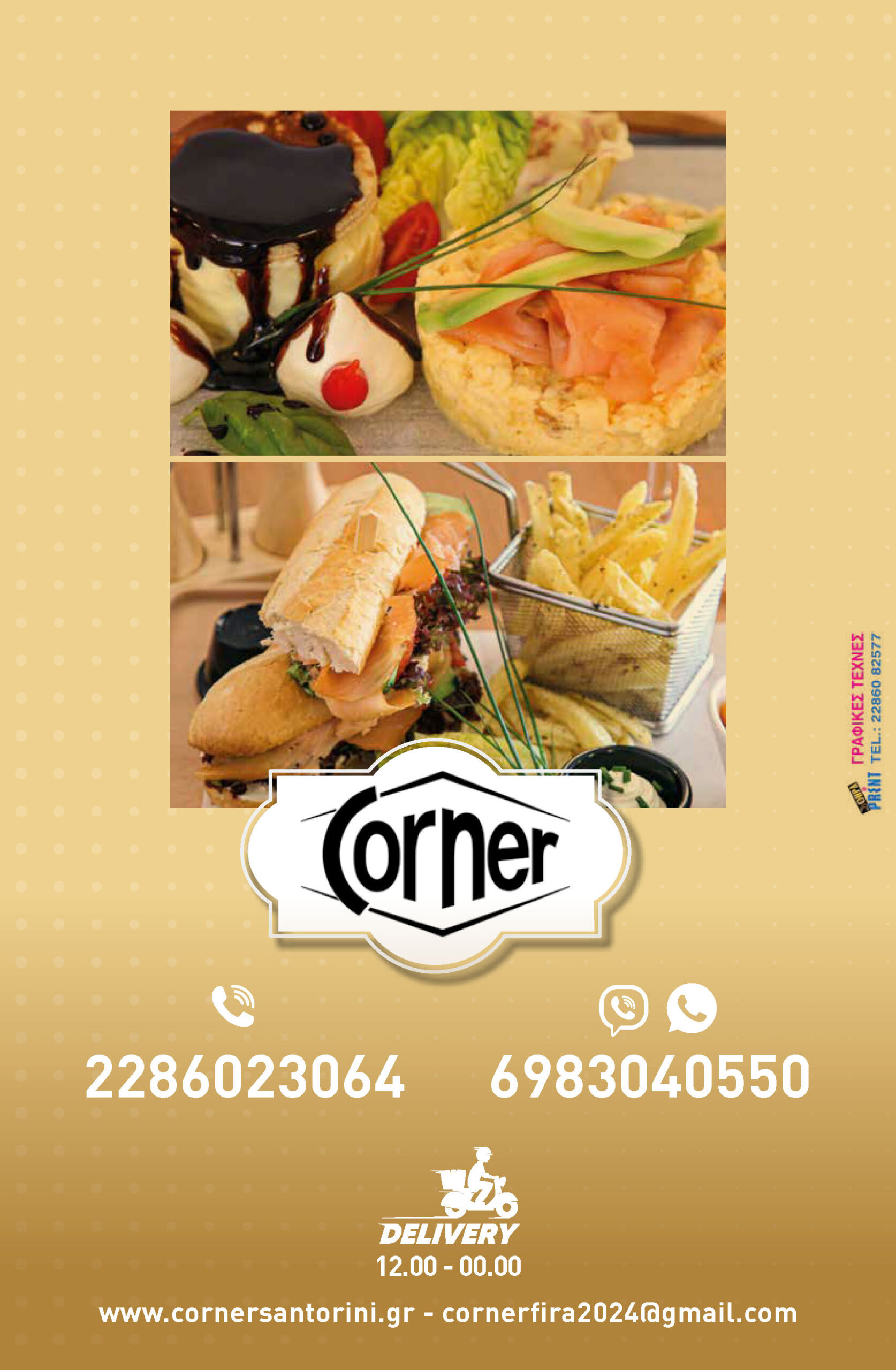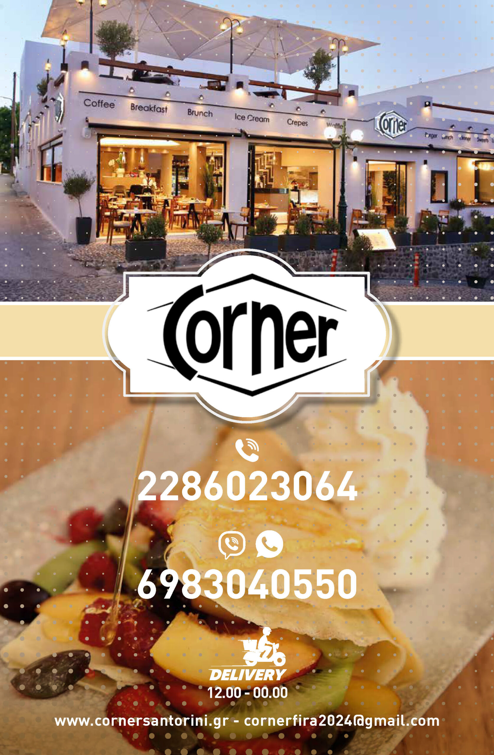 At Corner we offer to our customers a free delivery service so that they may enjoy a part of our menu at their place or even at the hotel they are staying in.