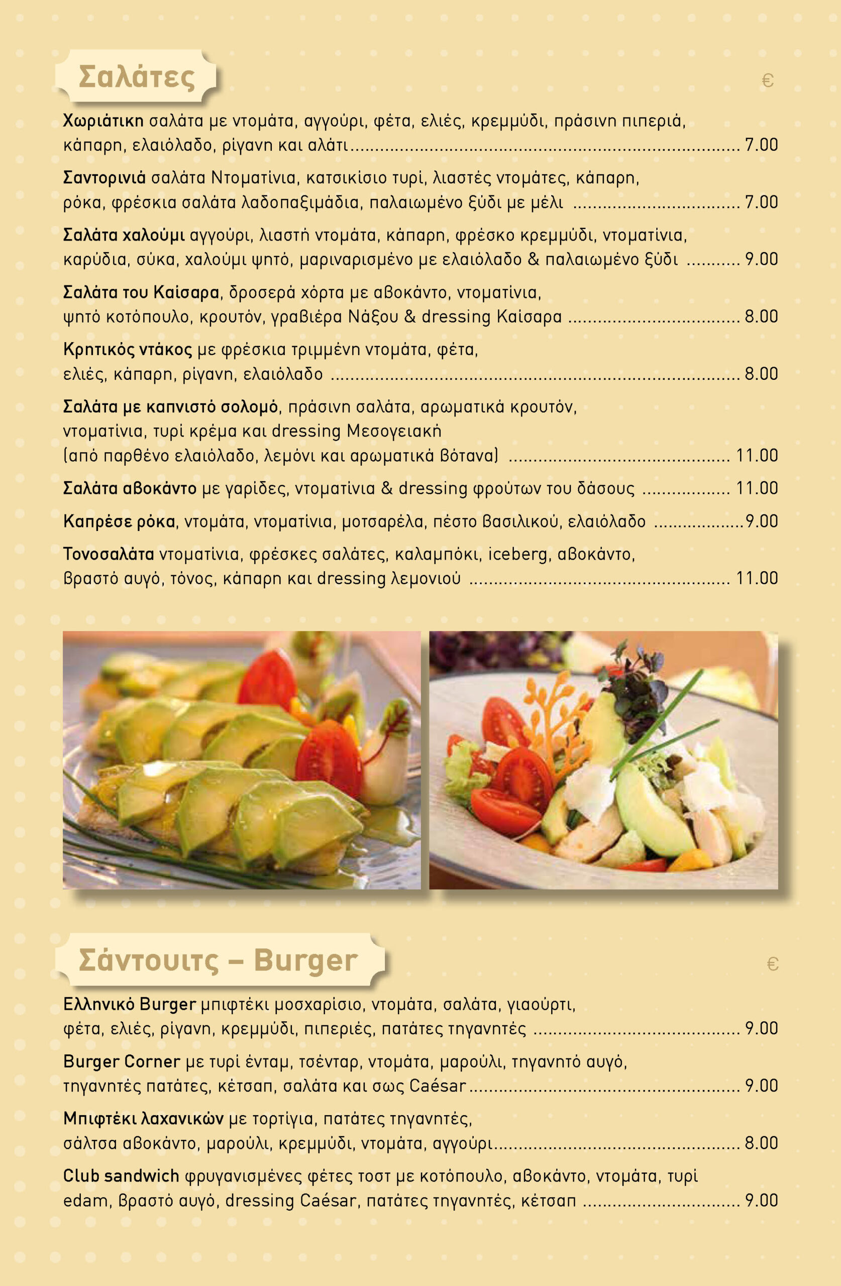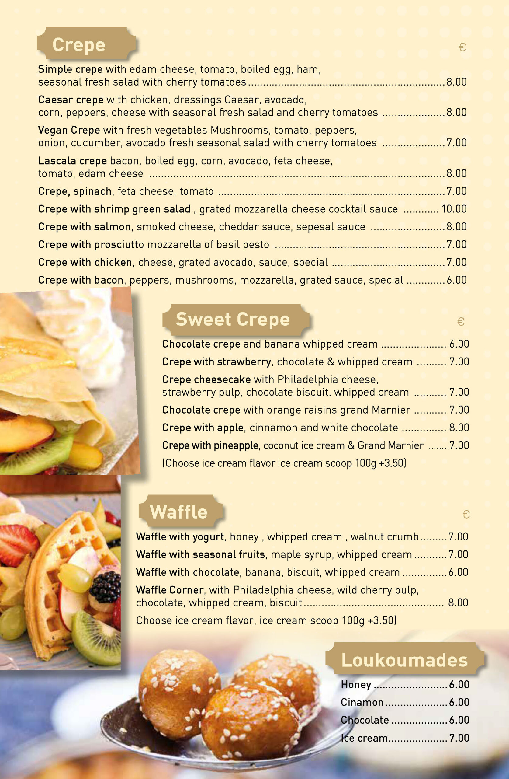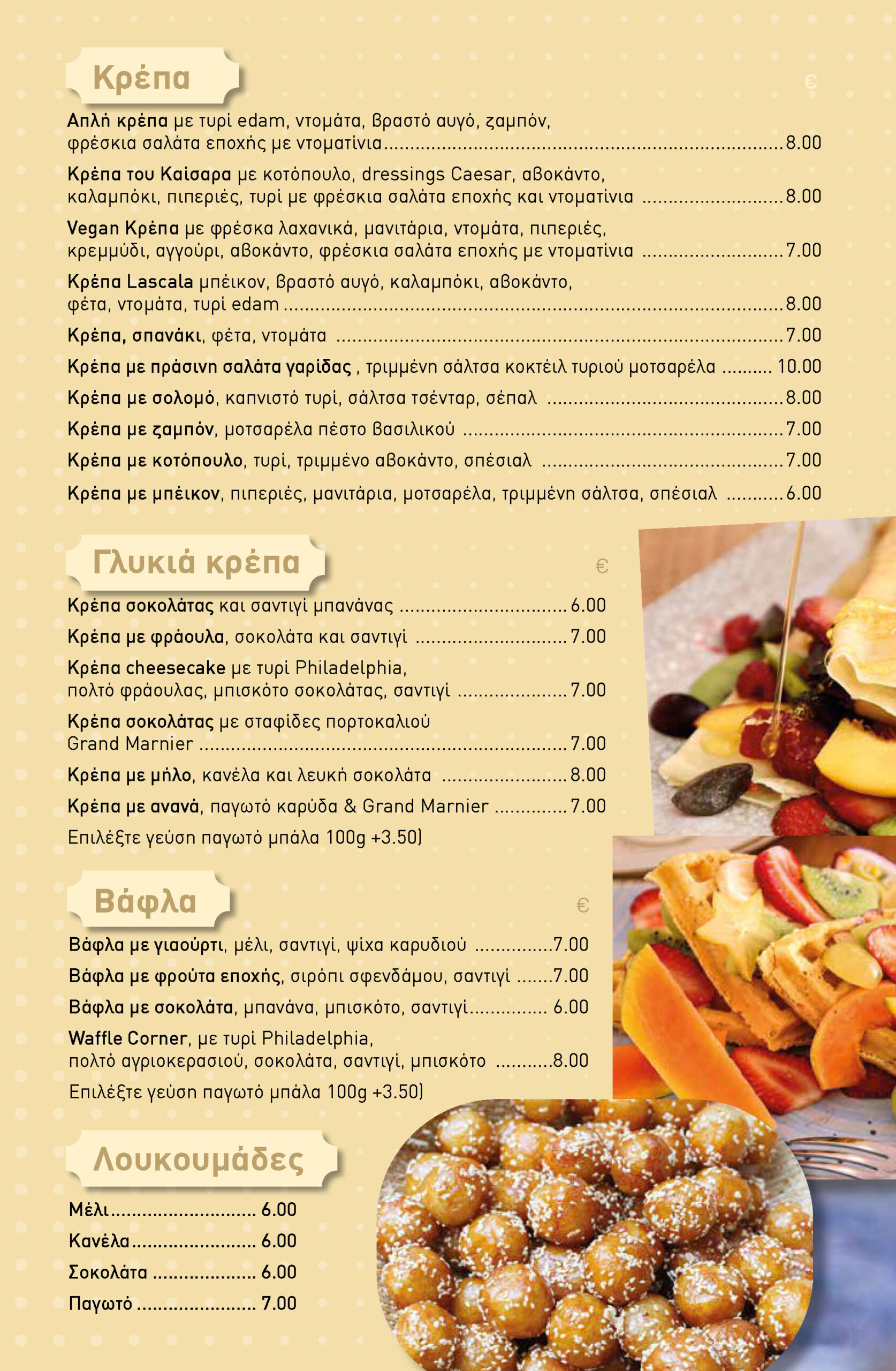 From our delivery menu, you can order crepes, waffles, loukoumades, salads, sandwiches, burgers, coffees, teas, fresh juices, and milkshakes.