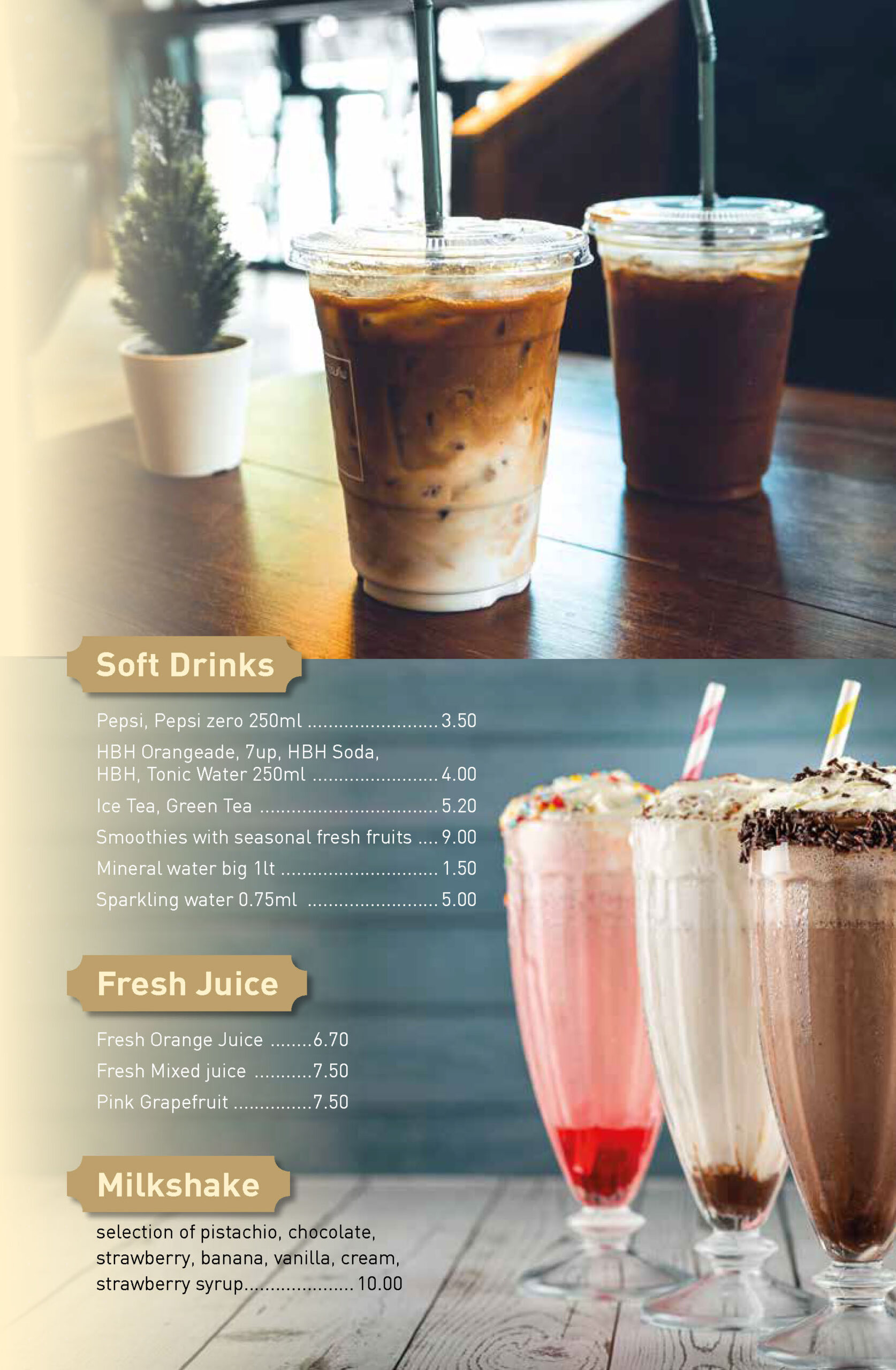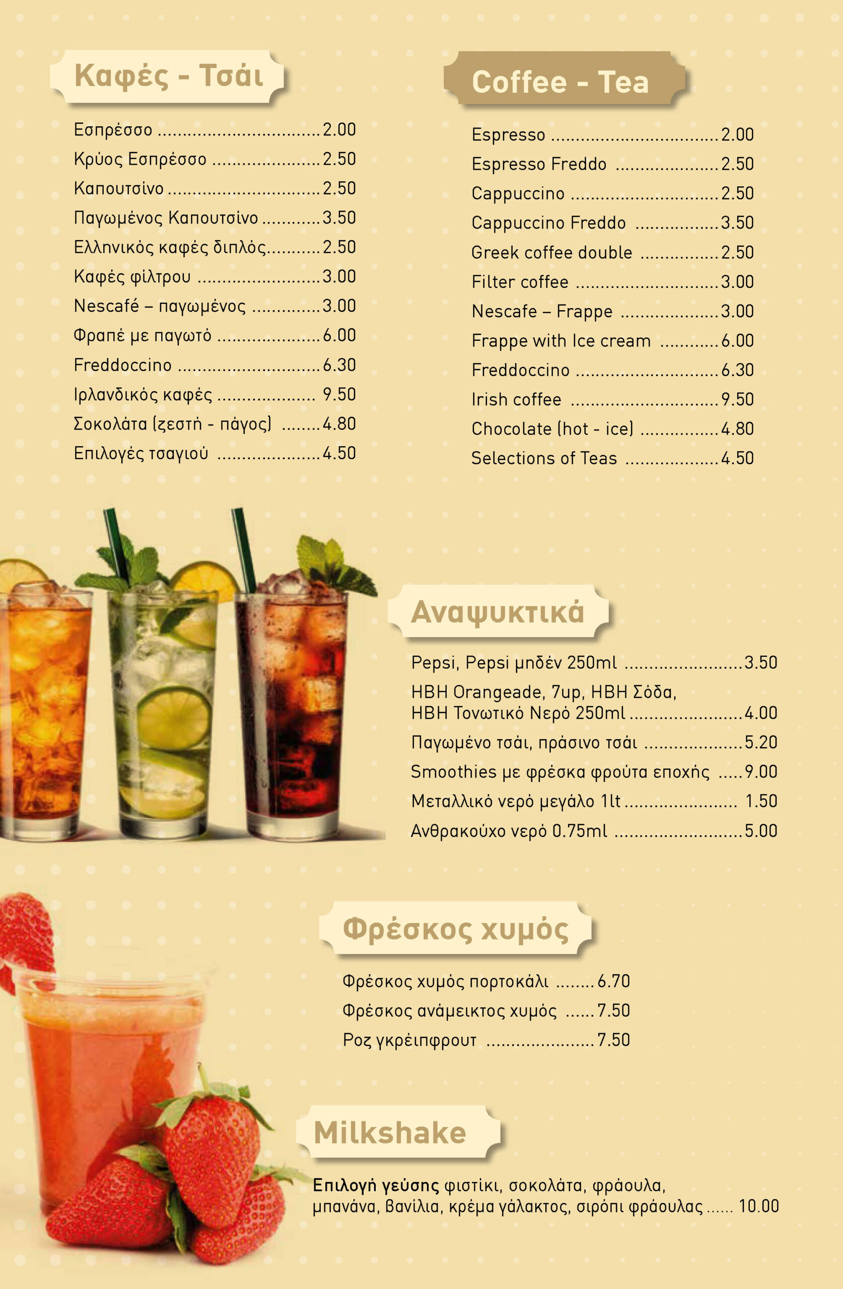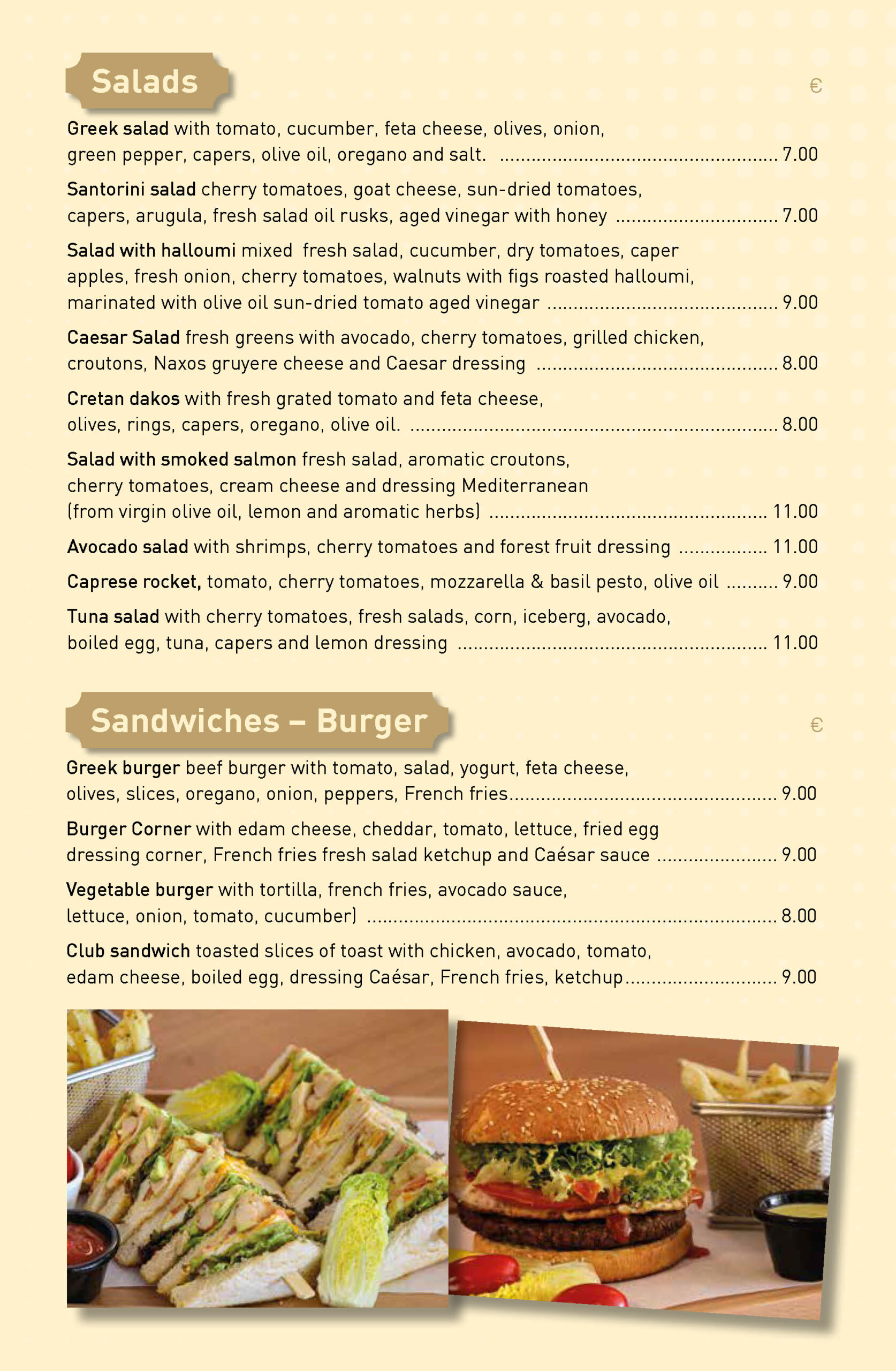 From our delivery menu, you can order crepes, waffles, loukoumades, salads, sandwiches, burgers, coffees, teas, fresh juices, and milkshakes.